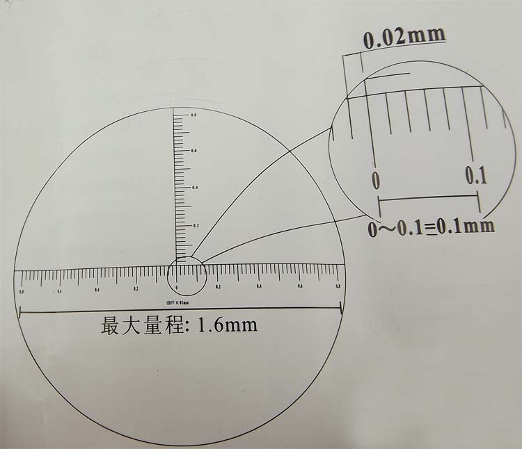- 3、本顯微鏡對準觀察物在調(diào)焦清晰時,顯微鏡刻度尺寸上的1小格等于實際尺寸0.005mm;0~0.1等于實際尺寸0.1mm,測量范圍0.005-1.0mm Zui大量程:1mm