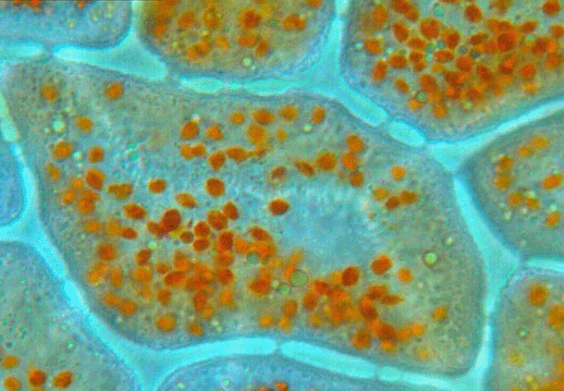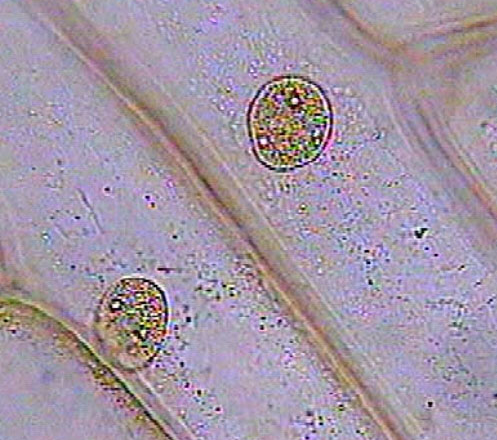 * 取最薄部分果皮,用水裝片,吸去多余水分后;