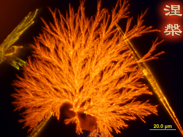 取圖儀器:熒光顯微鏡 軟件處理:無 圖片介紹:圖片是有機發(fā)光材料的晶體在熒光顯微鏡下的圖片。數(shù)量眾多的晶體在襯底上自行組裝成為鳳凰的形狀,更兼數(shù)學(xué)中的分形之美,在熒光顯微鏡下放出紅色的光芒,恰似一只浴火重生的鳳凰在展翅高飛。